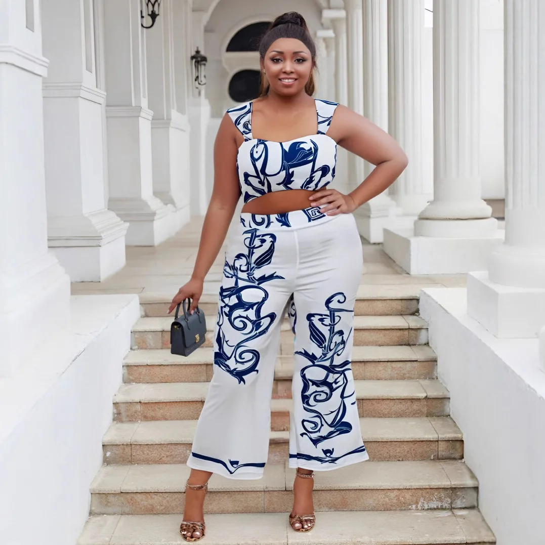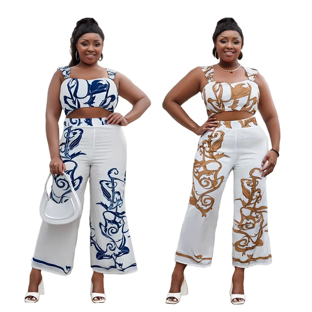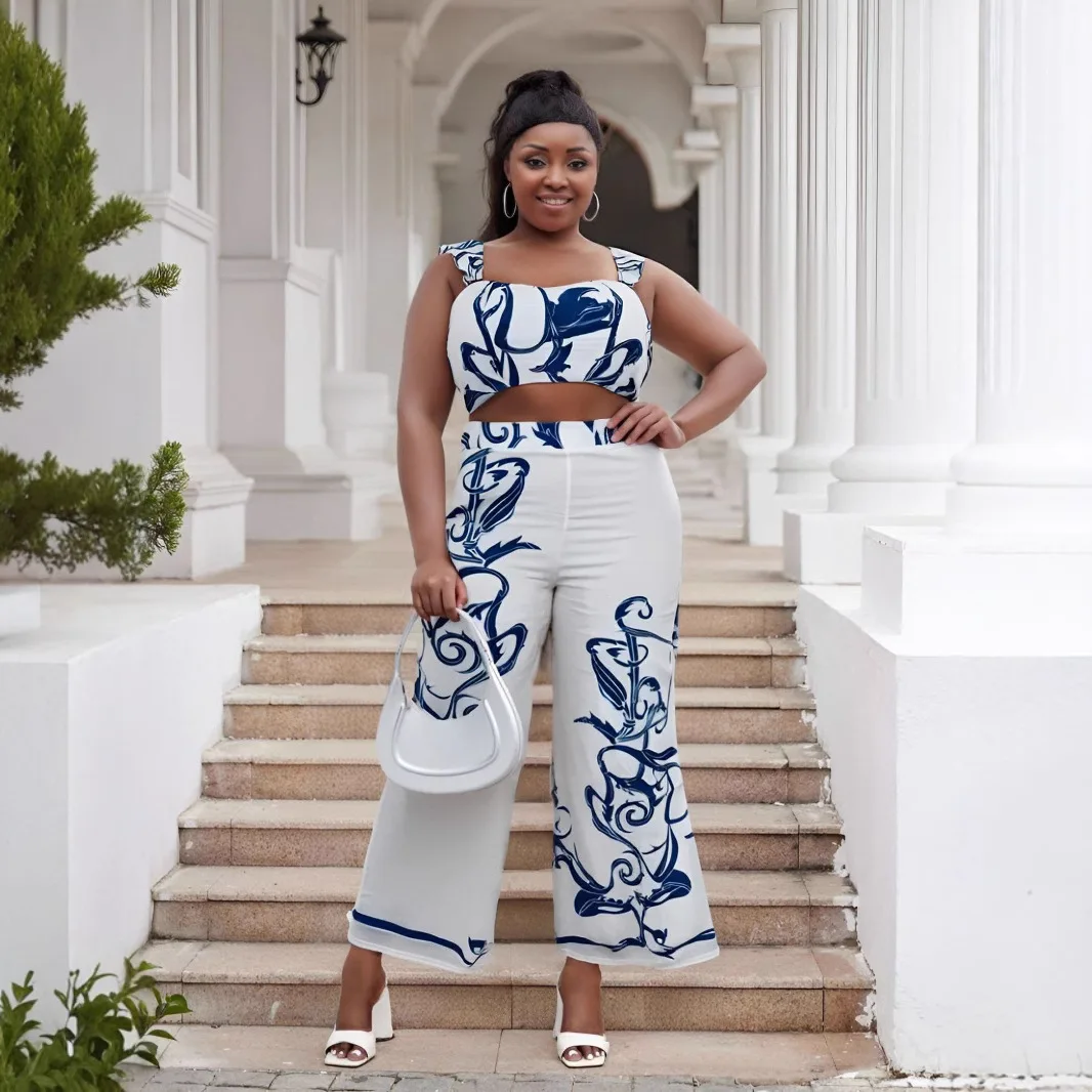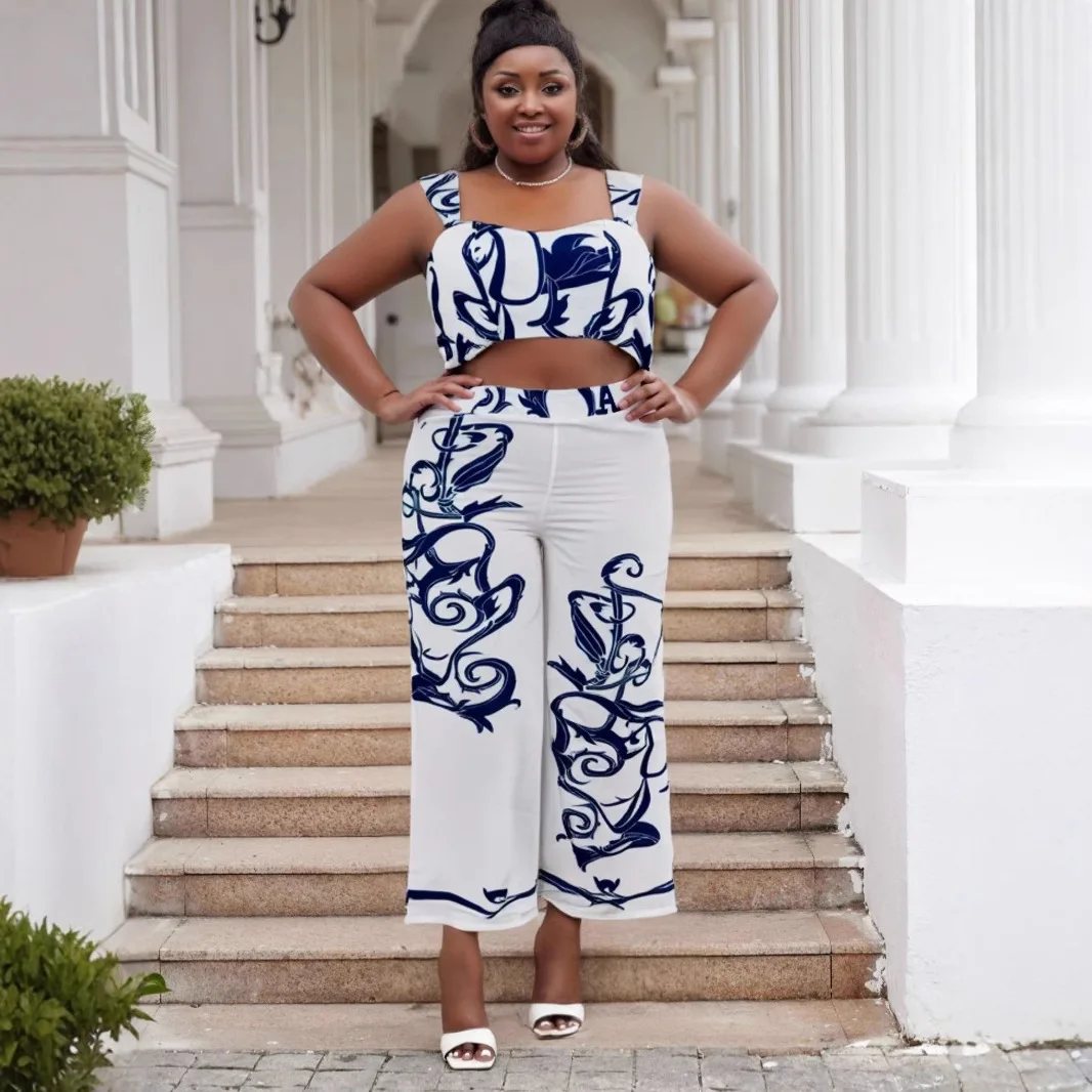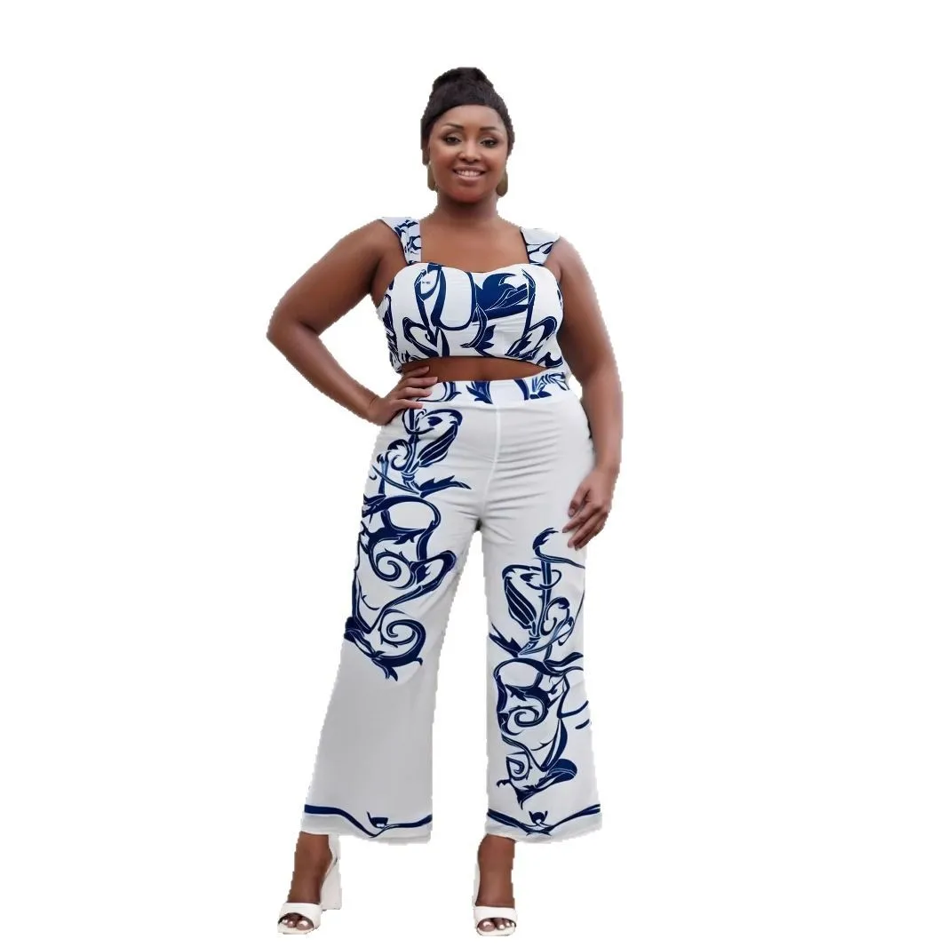 European American Sexy Cross-Border Women's Two-Piece Set High-Waisted Wide-Leg Pants Printed Suspenders Plus Size Casual for